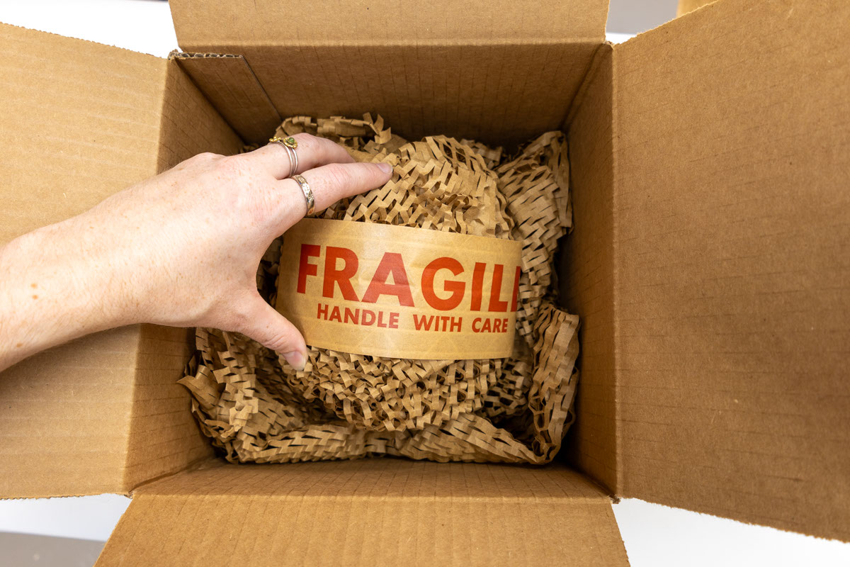 Close and tape the top securely, reinforcing every seam. Apply a fragile sticker on at least two sides of the box. While some people worry this draws rough handling, most delivery professionals do take extra care when they see these warnings.